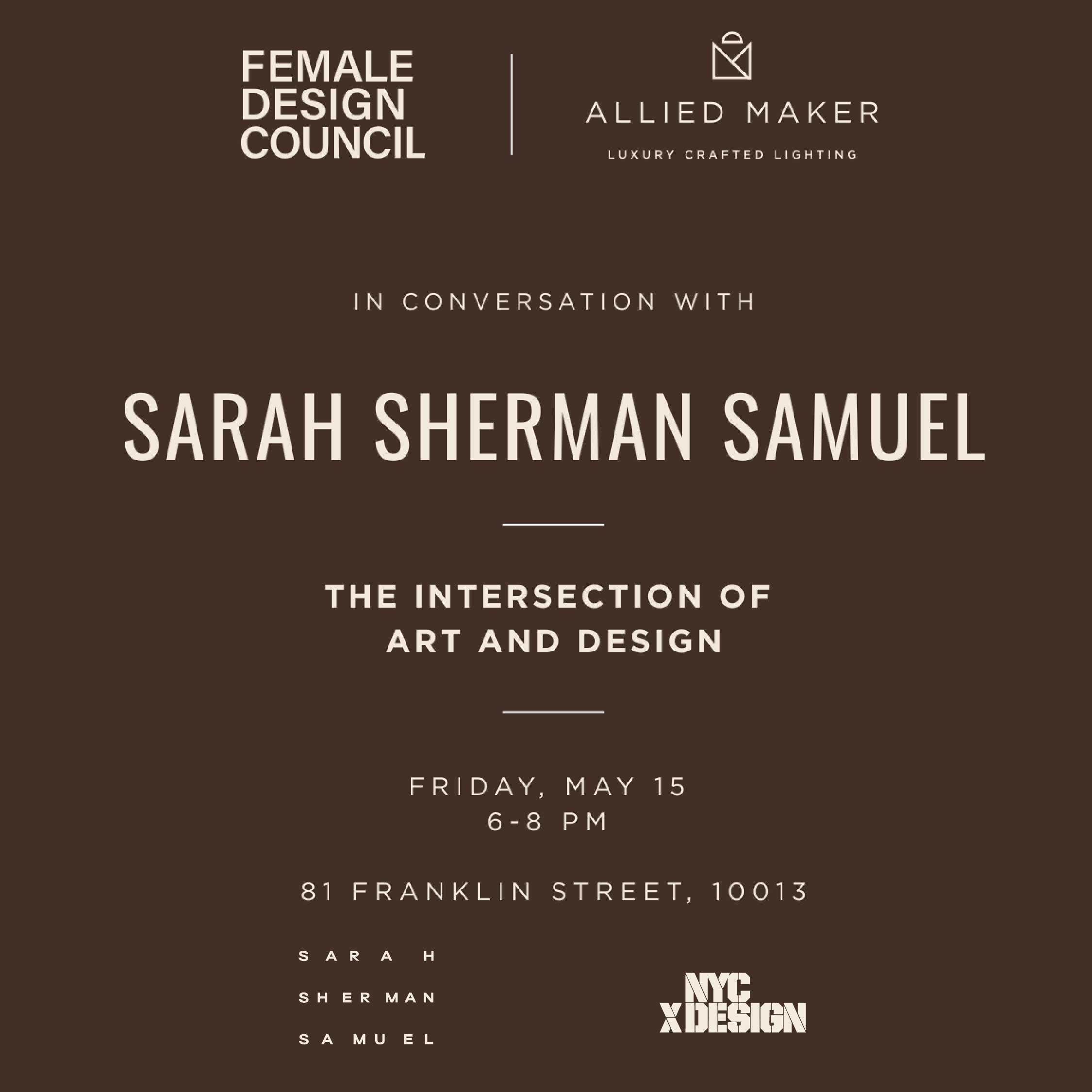 Join Female Design Council and Allied Maker as we celebrate “Sarah Sherman Samuel: The Intersection of Art and Design,” the highly anticipated monograph from celebrated designer and AD100 award winner Sarah Sherman Samuel. The event takes place during SoHo/Tribeca Design Night, as a part of NYCxDESIGN.